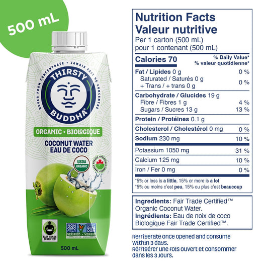THIRSTY BUDDHA Coconut Water - Pure Coconut Water- Premium Coconut Water- Organic Coconut Water- Fair Trade Certified Coconut Water- All Natural Hydration – Electrolytes – Sports Drink- No Added Sugar– Vegan –Non-GMO Coconut Water, 500ml (12/500ml)